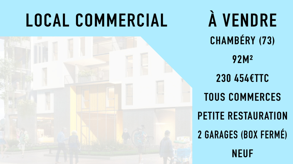 CHAMBÉRY (73) - Nous vous proposons un local commercial de 92,4 m² en RDC, toutes destinations (y compris petite restauration), dans une résidence neuve. Idéalement placé en plein coeur de l’éco-quartier Vetrotrex, à moins de 2km du centre-ville. Situé à 1km de la Gare de Chambéry, à moins de 15min en voiture de l’Aéroport Chambéry Savoie Mont Blanc. Lignes de bus à proximité immédiate. À moins de 10min en voiture de l’accès à l’A41 (reliant Annecy en 30min et Grenoble en moins d’1h) et de l’A43 (reliant Lyon). Les vitrines des commerces en acier ou alu à charge de l’acquéreur. Ce local, livré en coque brute, dispose également d'un accès à l'extérieur. Fluide et réseaux (eaux, assainissement, ventilation et chauffage) en attente, fourreaux en attente pour téléphonie et électricité. Vendu avec 2 garages (box fermé). Frais de notaire réduits. TVA récupérable si assujetti. Pour plus d'information nous contacter.