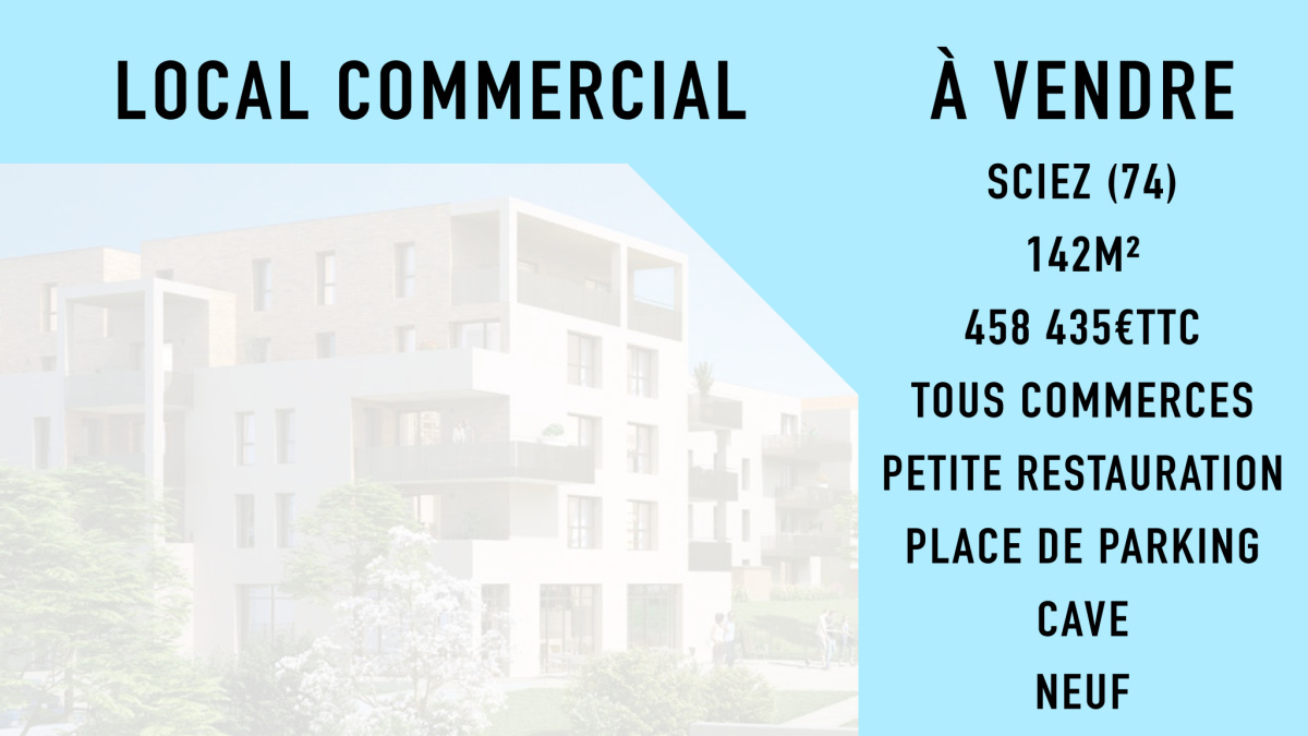SCIEZ-SUR-LÉMAN (74) - Nous vous proposons un local commercial de 142,81m² en RDC, toutes destinations (y compris petite restauration), dans une résidence disponible très prochainement. Idéalement placé au coeur du village, avec ses lignes de bus. Gare SNCF de Thonon à 15min en voiture. Les vitrines en acier ou alu seront à charge de l’acquéreur. Ce local, livré en coque brute, dispose également d'un accès à l'extérieur. Fluide et réseaux (eaux, assainissement, ventilation et chauffage) en attente, fourreaux en attente pour téléphonie et électricité. Vendu avec une place de parking en sous-sol et une cave. Frais de notaire réduits. TVA récupérable si assujetti. Pour plus d'information nous contacter.