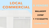 MALAKOFF (92) - Nous vous proposons à la vente un local commercial de 239,31m² situé en rez-de-chaussée d'une résidence neuve, au coeur du centre-ville de Malakoff. Ce bien bénéficie d'un emplacement stratégique, à moins de 10 minutes du périphérique avec une excellente desserte en transport en commun : métro Malakoff - Plateau de Vanves (ligne 13 vers Paris) et plusieurs lignes de bus à proximité immédiate. Le local est vendu brut de béton, façades posées hors vitrine, compteur ENEDIS posé et fluides en attente. Toutes activités possibles sauf restauration et supermarché. Orientation Nord-Ouest. Frais de notaire réduits et TVA récupérable si assujetti. Intéressé(e) ? Contactez-nous dès aujourd’hui pour plus d’informations ou une étude personnalisée de votre projet.