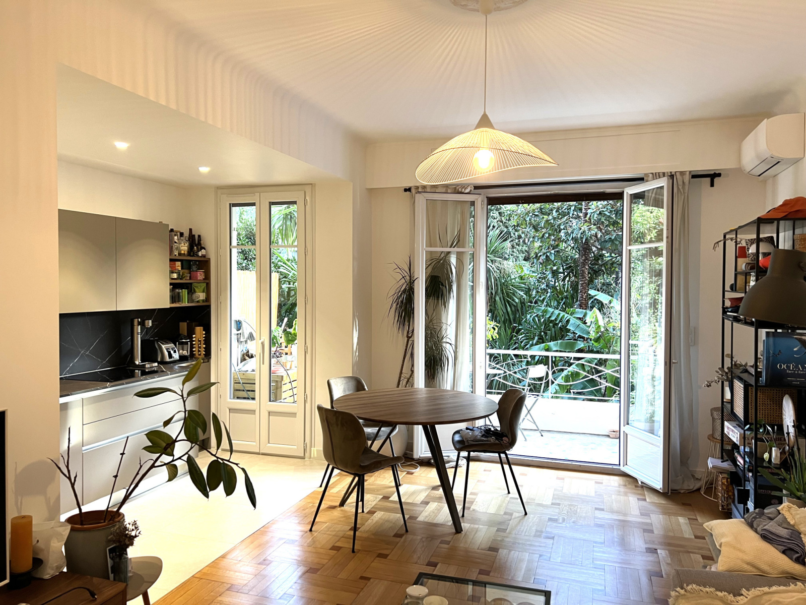 Avenue Mirabeau - Dans une résidence de standing avec gardien et jardin, très bel appartement 2P avec terrasse refait à neuf de 56.24m² se composant d'un séjour/cuisine de 27m², d'une grande chambre avec dressing de 17m², d'une salle d'eau avec wc. Toutes les pièces donnent sur la terrasse exposée sud, avec une vue magnifique sur le jardin exotique de la copropriété. La cuisine est vendue entièrement équipée et l'appartement peut être vendu meublé.