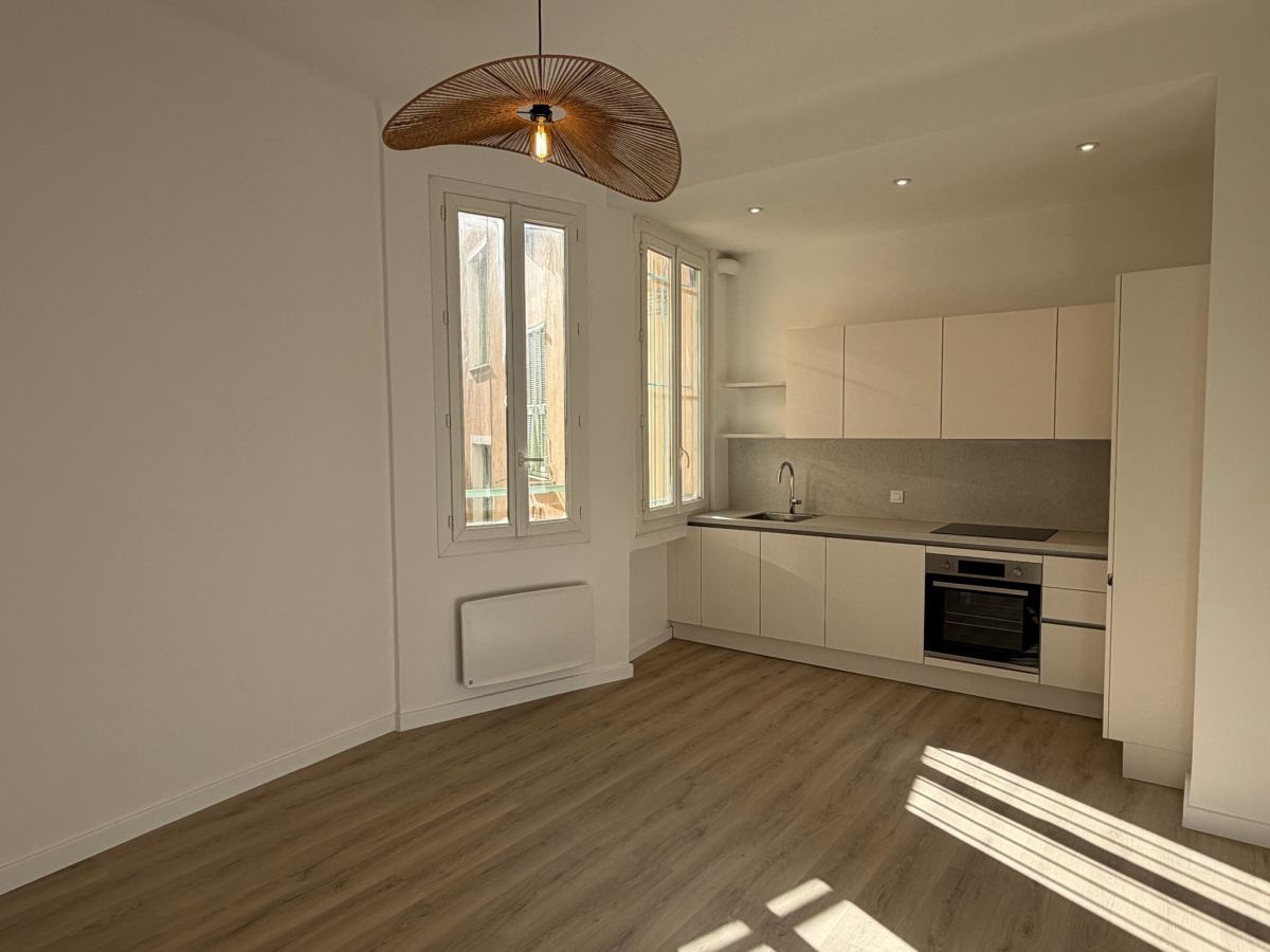 Port de Nice / Antiquaires - Dans un immeuble niçois au calme, très beau 2 pièces lumineux et refait à neuf composé d'un grand séjour de 20m² avec cuisine neuve, une salle d'eau avec douche à l'italienne et WC